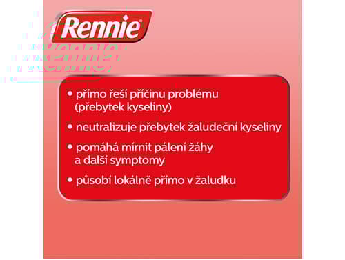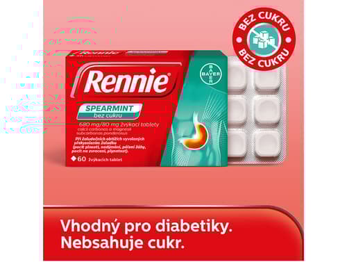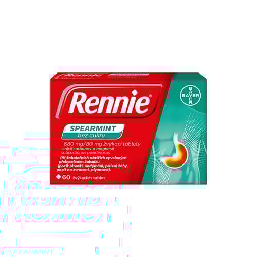 Rennie Spearmint bez cukru je léčivý přípravek ze skupiny antacid obsahující léčivé látky uhličitan vápenatý a těžký zásaditý uhličitan hořečnatý. Antacida chrání sliznici žaludku a tenkého střeva tím, že působí proti překyselení žaludeční šťávy. Žvýkací tablety neutralizují přebytečnou žaludeční kyselinu a obnovují normální rovnováhu ve složení žaludeční šťávy. Tak jsou žaludeční a střevní sliznice chráněny proti škodlivým vlivům. Jelikož jsou žvýkací tablety dobře rozpustné, nastupují účinky přípravku rychle. Přípravek se užívá při překyselení žaludku a tím vyvolaných žaludečních obtížích (pálení žáhy, pocit plnosti, nadýmání, pocit na zvracení, zvracení, plynatost). Přípravek je určen pro dospělé a dospívající od 15 let. Balení obsahuje 60 žvýkacích tablet.