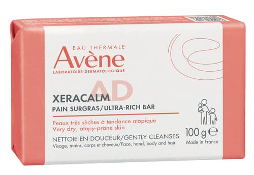 AVENE XeraCalm A.D Ultra Nourishing Cleansing Bar je dermatologická kostka bez mýdla s neutrálním pH, ideální pro velmi suchou pokožku se sklonem k atopickému ekzému a svědění. Jemně čistí obličej, tělo i vlasy kojenců, dětí i dospělých. Obsahuje I-modulia® pro zmírnění svědění a pupalkový olej pro výživu a obnovu kožní bariéry.