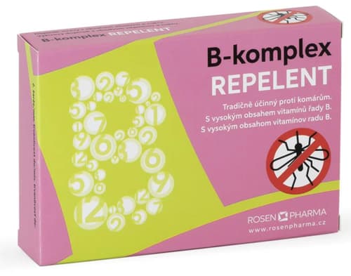 Doplněk stravy. Rosen B-komplex Repelent je doplněk stravy, který přináší inovativní řešení v podobě prvního repelentu v tabletové formě. Tento přípravek využívá tradičně osvědčený účinek thiaminu (vitamínu B1), který se z těla vylučuje potem a močí, čímž odpuzuje komáry. Kromě thiaminu obsahuje vitamíny B2, B6, B5, B3, B7, kyseliny listové (B9) a vitamínu B12 (kyanokobalamin). Tento doplněk tak nejen chrání proti komárům, ale také pokryje denní potřebu vitamínů skupiny B. B-komplex Repelent je ideální pro použití k vodě, na dovolené, při sportu a během letních měsíců (od května do září), kdy je zvýšený výskyt komárů. Nepřekračujte doporučené denní dávkování. Uchovávejte mimo dosah dětí. Doplňky stravy nejsou náhradou pestré a vyvážené stravy. Balení obsahuje 25 dražé. Hmotnost obsahu: 12,5 g.