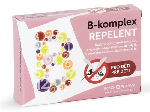 Doplněk stravy. Rosen B-komplex Repelent pro děti je doplněk stravy s obsahem vitamínů a cukru. První repelent v tabletové formě. Využívá tradičně osvědčený účinek proti komárům. Obsahuje 26,4 mg thiaminu (Thiamin se z těla vylučuje potem a močí, a tím odpuzuje komáry). Obsahují vitamíny skupiny B - vitaminy B1, B2, B6, B5, B3, B7, kyselinu listovou B9 a vitamín B12 kyanokobalamin. Pokrývá denní potřebu vitamínů skupiny B a navíc chrání proti komárům. Určeno pro děti od 3 let. B-komplex Repelent je vhodný: pro použití k vodě, na dovolenou, při sportu, pro užívání v období květen až září. Nepřekračujte doporučené denní dávkování. Uchovávejte mimo dosah dětí. Doplňky stravy nejsou náhradou pestré a vyvážené stravy. Balení obsahuje 25 dražé. Hmotnost obsahu 12,5 g.