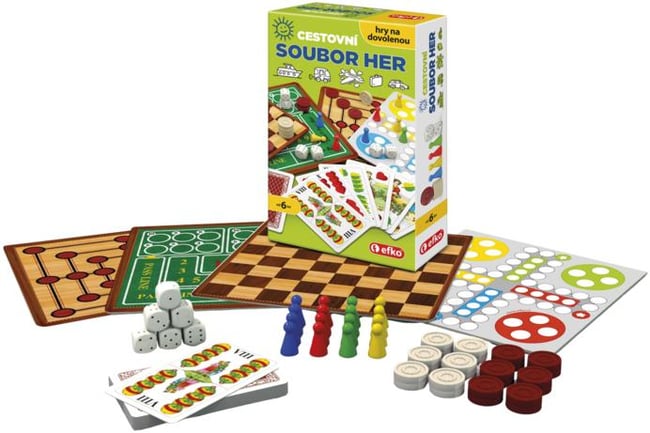 Cestovní soubor her je praktická sada plná zábavy, která se vejde do batohu i do šuplíku. Nabízí výběr nejpopulárnějších her v kompaktním balení – ideální na cesty, dovolené i volné chvíle doma. Najdete v ní vše potřebné ke klasickému Člověče, nezlob se!, dámě, šachům, karetním hrám i kostkám. Hraní podporuje logiku, soustředění i společný čas bez obrazovek.