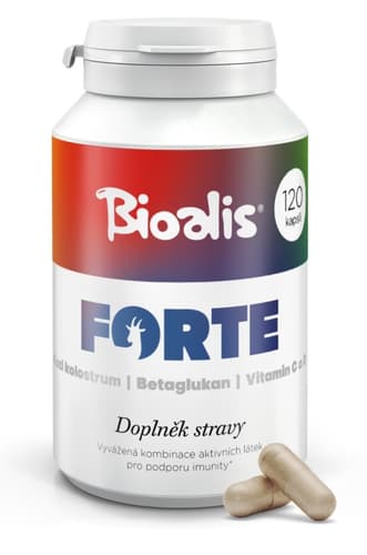 Doplněk stravy. Bioalis Forte obsahuje 100% kozí kolostrum, přírodní 80% betaglukan, vitamin C, který přispívá k normální funkci imunitního systému, nervové soustavy a k ochraně buněk před oxidativním stresem, a vitamin D, který napomáhá zdravému stavu kostí a zubů, správné činnosti svalů, vstřebávání vápníku, fosforu a podílí se na procesu dělení buněk. Kozí kolostrum a betaglukany jsou zdrojem mnoha cenných látek, jako jsou imunoglobuliny, cytokiny, laktoferin, PRP faktor, esenciální aminokyseliny. Benefity: Prémiová kvalita jednotlivých surovin a jejich vysoký obsah v denní dávce. Komplexní doplněk stravy vhodný pro celou rodinu. Vhodné pro vegetariány. Neobsahuje lepek. Nepřekračujte doporučené denní dávkování. Uchovávejte mimo dosah dětí. Doplňky stravy nejsou náhradou pestré a vyvážené stravy. Balení obsahuje 120 kapslí. Hmotnost obsahu 52 g.