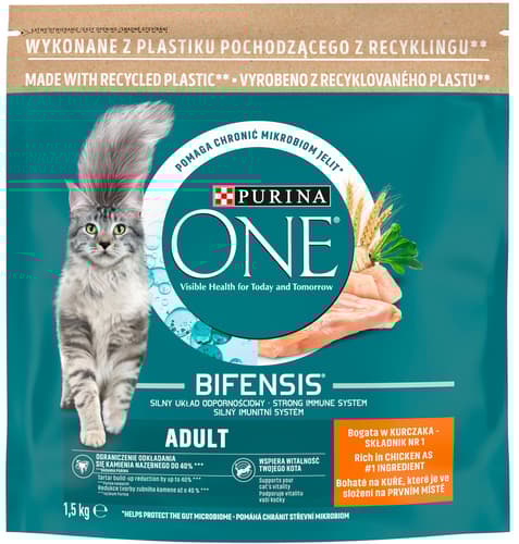 Purina ONE Bifensis Adult s kuřetem je kompletní krmivo určené pro dospělé kočky od 1 roku věku. Obsahuje pečlivě vyváženou kombinaci živin včetně kvalitních bílkovin, prebiotik z čekanky a omega mastných kyselin. Kuře je ve složení na prvním místě a dodává potřebné aminokyseliny pro udržení svalové hmoty. Díky obsaženým prebiotikům a vybraným složkám podporuje dobré trávení a celkovou vitalitu. Krmivo neobsahuje žádná přidaná barviva.