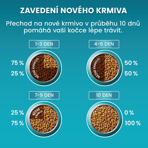 Pokud podáváte krmivo Purina One poprvé, doporučujeme zavádět jej postupným přidáváním stále většího množství Purina One do stávajícího krmiva po dobu 7 dnů, aby se trávicí systém vaší kočky snáze přizpůsobil novému krmivu.