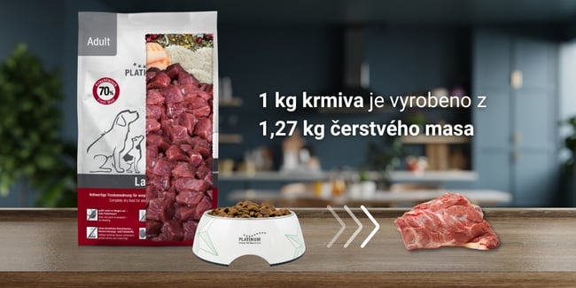 PLATINUM je německé krmivo pro psy a kočky, které obsahuje minimálně 70 % čerstvého masa v potravinářské kvalitě. Na rozdíl od běžných granulí neobsahuje masokostní moučku, ale čerstvé maso je šetrně vařeno ve vlastní šťávě metodou Fleischsaftgarung (FSG), což zachovává jeho přirozenou chuť, vůni i živiny. Výsledkem jsou poloměkké granule, které psi milují. Stejnou metodou jsou vyráběny také pamlsky a mokré krmivo.