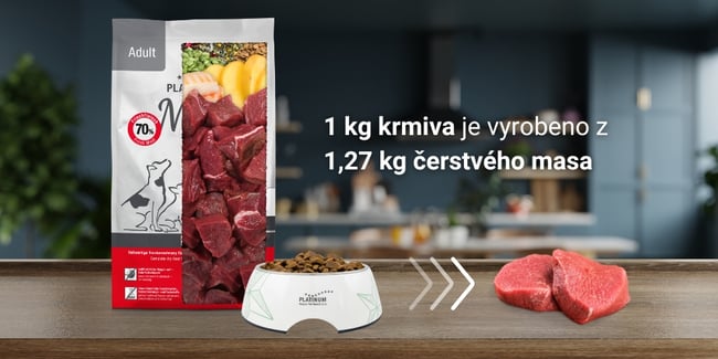 PLATINUM je německé krmivo pro psy a kočky, které obsahuje minimálně 70 % čerstvého masa v potravinářské kvalitě. Na rozdíl od běžných granulí neobsahuje masokostní moučku, ale čerstvé maso je šetrně vařeno ve vlastní šťávě metodou Fleischsaftgarung (FSG), což zachovává jeho přirozenou chuť, vůni i živiny. Výsledkem jsou poloměkké granule, které psi milují. Stejnou metodou jsou vyráběny také pamlsky a mokré krmivo.