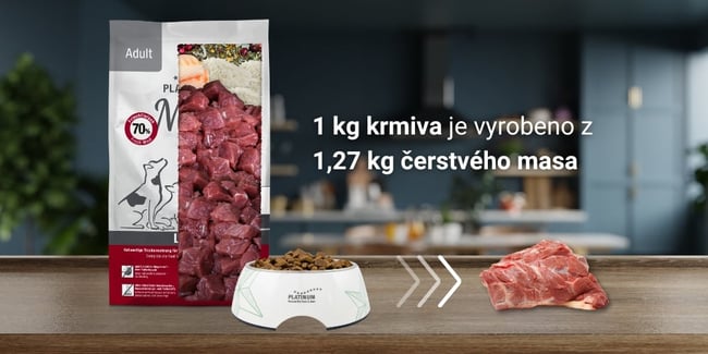 PLATINUM je německé krmivo pro psy a kočky, které obsahuje minimálně 70 % čerstvého masa v potravinářské kvalitě. Na rozdíl od běžných granulí neobsahuje masokostní moučku, ale čerstvé maso je šetrně vařeno ve vlastní šťávě metodou Fleischsaftgarung (FSG), což zachovává jeho přirozenou chuť, vůni i živiny. Výsledkem jsou poloměkké granule, které psi milují. Stejnou metodou jsou vyráběny také pamlsky a mokré krmivo.
