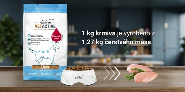 S Platinum VetActive Light dostane váš pes vyvážené dietní krmivo, které je šetrné a nabízí mu plný chuťový zážitek. Vysoce kvalitní ingredience a snížený obsah energie a tuku pomáhají vašemu psovi snížit nebo udržet váhu.