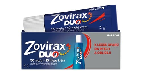 Krém Zovirax Duo se používá u dospělých a dospívajících starších 12 let k léčbě prvních známek a příznaků oparů na rtech a na pokožce v okolí rtů (např. brnění, svědění nebo zarudnutí), aby se snížila pravděpodobnost, že se opar rozvine do puchýřku. Zovirax Duo obsahuje dvě léčivé látky: aciklovir a hydrokortison. Aciklovir je antivirotikum, které pomáhá bojovat s virem způsobujícím opary. Hydrokortison je slabý steroid, který zmírňuje zánět, rozvíjející se při oparu. I když u Vás dojde k tvorbě puchýřku, Zovirax Duo zkrátí dobu hojení o přibližně půl až jeden den v porovnání s krémem bez léčivých látek. Vlastnosti krému Zovirax Duo: Používá se k léčbě prvních známek a příznaků oparů na rtech a na pokožce v okolí rtů. Obsahuje aciklovir (antivirotikum) a hydrokortison (protizánětlivý steroid). Zkrátí dobu hojení o přibližně půl až jeden den v porovnání s krémem bez léčivých látek. Balení obsahuje 2 g.