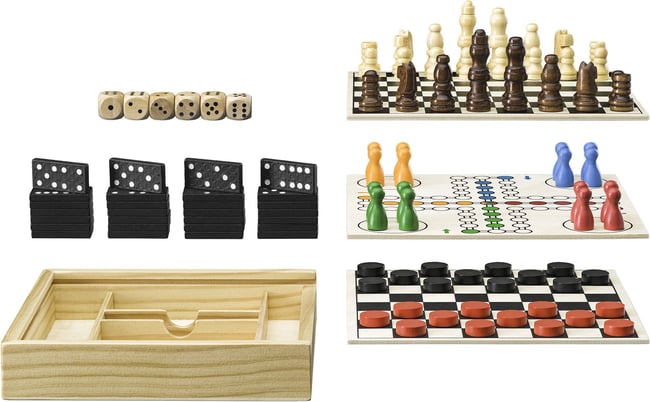 Soubor stolních her v dřevěném boxu, jehož víko tvoří oboustranná hrací deska pro jednotlivé společenské hry (šachy, dáma, člověče, nezlob se). Ke každé společenské hře najdete i příslušné figurky a hrací kostky. Součástí setu jsou i hrací kameny domina a sada hracích kostek.