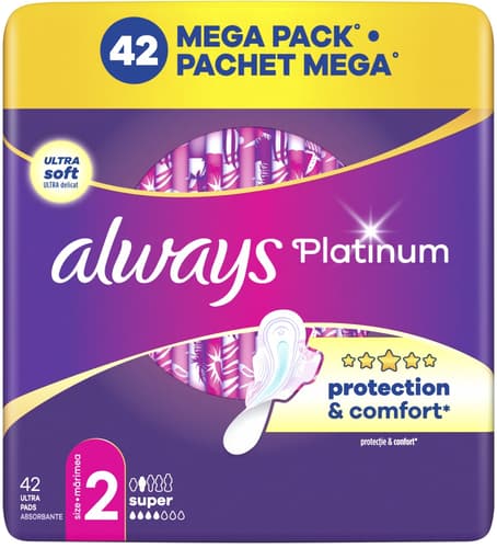 Hygienické vložky Always Platinum Super (velikost 2) doporučujeme používat během dne při středně silné menstruaci. Vyzkoušet můžete také vložky Always Platinum Secure Night (velikost 4), které zajistí ochranu i v noci.