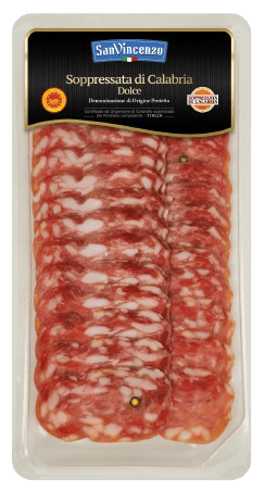 Delikátní klobása z jihu Itálie, vyráběná podle tradičních receptur a norem chráněného označení původu DOP. Soppressata od San Vincenzo se vyrábí z pečlivě vybraného vepřového masa z Kalábrie, jemně okořeněného solí a černým pepřem.