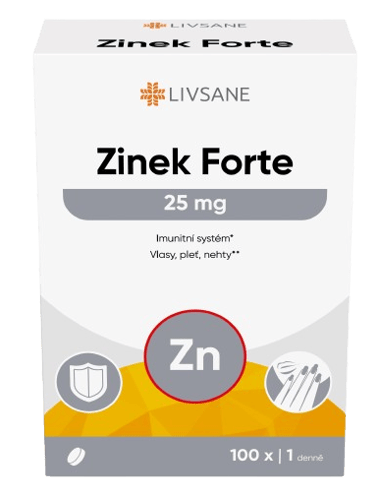 Doplněk stravy. LIVSANE Zinek Forte je doplněk stravy ve formě tablet s obsahem 25 mg zinku. Zinek podporuje správnou funkci imunitního systému a přispívá k dobrému stavu vlasů, pleti a nehtů. Bez lepku a laktózy. Vhodný i pro vegany. Nepřekračujte doporučené denní dávkování. Uchovávejte mimo dosah dětí. Doplňky stravy nejsou náhradou pestré a vyvážené stravy. Balení obsahuje 100 tablet. Hmotnost obsahu 26 g.