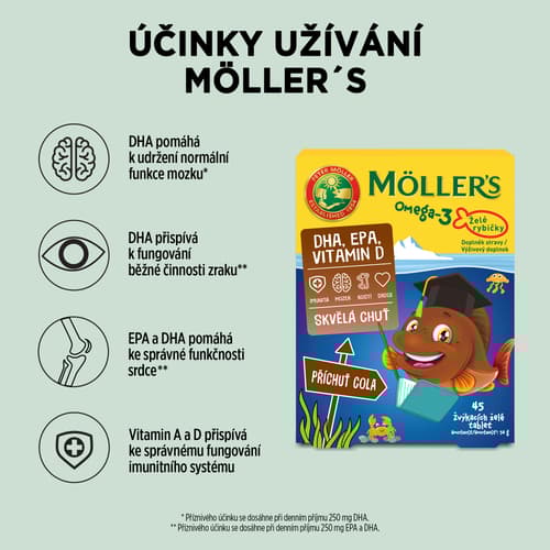 Kontraindikace: Möller's Omega-3 želé rybičky nejsou určeny pro děti do 3 let. Obsahuje sladidlo. Nadměrná konzumace může vyvolat projímavé účinky.