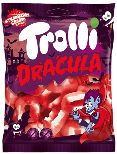 Sladké želatinové bonbony ve tvaru zubů s ovocnou příchutí. Tvar zubů upíra, měkká textura a krémově jahodová příchuť potěší malé i velké mlsouny.