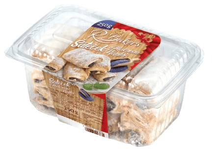 Náplň 40 % (cukr, 22 % mák, pitná voda, švestkové pyré, jablečné pyré, pšeničné klíčky, řepkový olej, pšeničná krupice, karamelizovaný cukr, přírodní aroma, konzervant: E202, dekorační moučkový cukr (dextróza, pšeničný škrob, sušené mléko, aroma))