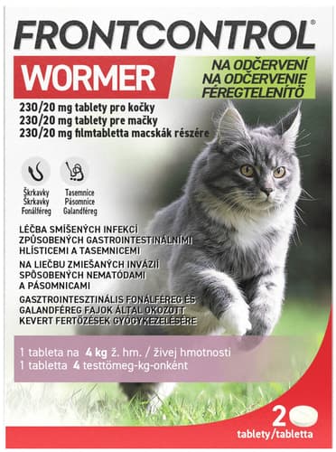 Veterinární přípravek. Frontcontrol Wormer tablety je veterinární léčivý přípravek na odčervení koček. Jsou určené k léčbě smíšených infekcí způsobených vnitřními parazity. Působí proti nejčastějším hlísticím a tasemnicím, které se u koček vyskytují. Účinné proti: Hlísticím - Toxocara cati, Toxascaris leonina a tasemnicím - Dipylidium caninum, Taenia taeniaeformis, Echinococcus multilocularis. Vlastnosti produktu: Tablety pro kočky na odčervení. Jedna tableta na 4 kg živé hmotnosti. Tablety lze dělit na dvě stejné části – snadné dávkování. Balení obsahuje 2 tablety.