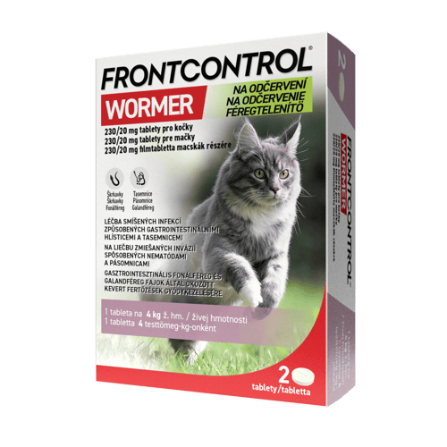 Veterinární přípravek. Frontcontrol Wormer tablety je veterinární léčivý přípravek na odčervení koček. Jsou určené k léčbě smíšených infekcí způsobených vnitřními parazity. Působí proti nejčastějším hlísticím a tasemnicím, které se u koček vyskytují. Účinné proti: Hlísticím - Toxocara cati, Toxascaris leonina a tasemnicím - Dipylidium caninum, Taenia taeniaeformis, Echinococcus multilocularis. Vlastnosti produktu: Tablety pro kočky na odčervení. Jedna tableta na 4 kg živé hmotnosti. Tablety lze dělit na dvě stejné části – snadné dávkování. Balení obsahuje 2 tablety.