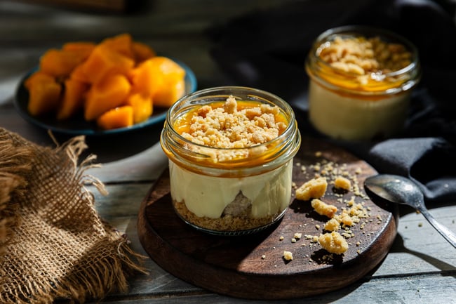 Luxusní veganský dezert s kokosovo-vanilkový pudinkem, šťavnatým mangem a křupavou drobenkou na povrchu. Má krémovou strukturu a je tak výborný, že vám už zůstane navždy v košíku.