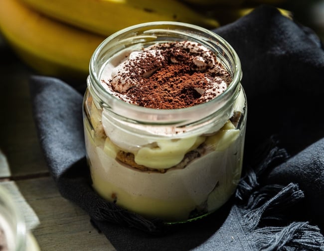 Nadýchaný krém se snoubí s chutí banánu a jemně nasáklými piškoty. Chuť kakaa dává dezertu hloubku, kterou si zamilujete. Dopřejte si tuto veganskou specialitu z naší kuchyně.