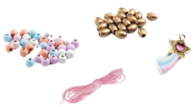 - Balení obsahuje 400 dřevěných korálků, přívěšky a bužírku na navlékání.
