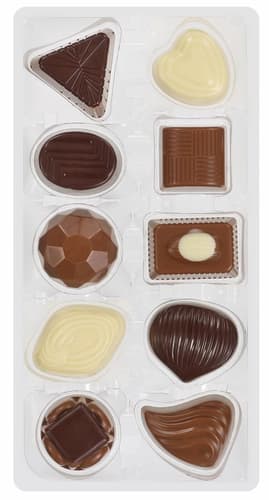Směs belgických pralinek z mléčné, hořké a bílé čokolády s lískovými oříšky, karamelem, pomerančem a dalšími ingrediencemi.