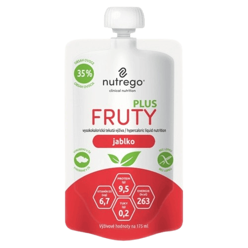 Potravina pro zvláštní lékařské účely. Nutrego Fruty Plus je vysokokalorická, nutričně nekompletní tekutá výživa s 35% obsahem ovoce a jablečnou příchutí. Je určena výhradně k enterálnímu použití jako součást dietního postupu při podvýživě nebo riziku jejího vzniku. Díky minimálnímu obsahu tuku je vhodná pro pacienty s nutností jeho omezení ve stravě. Obsahuje přirozenou vlákninu, neobsahuje lepek a je obohacena o vitamin D. Určeno k přímému použití, nejlépe chutná vychlazený. Balení obsahuje 4 x 175 ml.