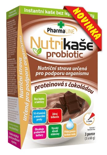 Nutrikaše probiotic proteinová s čokoládou je chutná, snadno připravitelná instantní rýžová kaše se zvýšeným obsahem bílkovin a čokoládou. Obsažený protein je kombinací rostlinného a živočišného původu. I při této fortifikaci zůstává Nutrikaše bez obsahu lepku a laktózy. Tato lehce stravitelná kaše je vhodná pro jedince, kteří mají výživové omezení při nesnášenlivosti lepku, intoleranci na laktózu, pro zájemce o racionální stravování, sportovce, rekonvalescenty nebo jako ekonomická alternativa ke snídani, večeři nebo svačině. Obsahuje živočišné a rostlinné bílkoviny, které jsou základním stavebním kamenem všech tkání v těle. Obsahuje 10 vitaminů a minerální prvky. Biotin, mangan, niacin, vitamin C, B12, B6, B2, zinek, železo a vitamin E. Jedna porce obsahuje 5 miliard probiotických bakterií Bacillus coagulans. K přislazení je používán ovocný cukr - monosacharid fruktóza. Fruktóza má příznivější glykemický index a běžně se vyskytuje ve zralém ovoci. Pro podporu trávení jsou obohaceny o vysoký obsah kvalitní vlákniny z čekanky. Jedna porce průměrně obsahuje 6 % vlákniny inulin. Balení obsahuje 180 g (3x60 g).