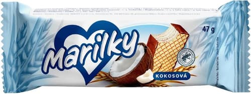 Oplatek s kokosovou náplní obvodově máčený v tmavé polevě.