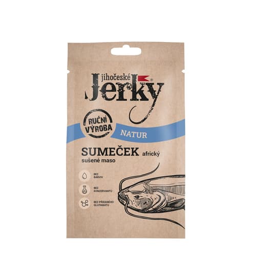 Sušené zauzené pásky čistého masa ze sumečka afrického. Jerky jsou vyrobeny ze 100% čisté rybí svaloviny a vynikají vysokým obsahem bílkovin. Vyrábějí se z libového masa, které je ochucené pouze přírodními složkami, jsou proto bez lepku, cukru, umělých dochucovadel, barviv či konzervantů.