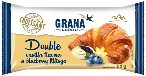 Balené jemné pečivo s vanilkovo-borůvkovou náplní.