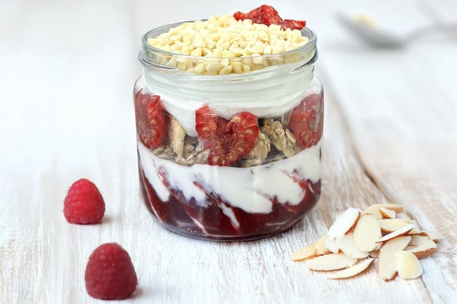 Užijte si osvěžující kombinaci voňavých malin z farmy Smržice na Moravě a loupaných mandlí v hustém řeckém jogurtu plném bílkovin.