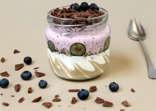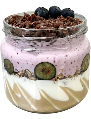 Smetanový jogurt 63% (mléko, smetana, jogurtová kultura), borůvky 9%. borůvkový džem (borůvky, cukr, koncentrovaná citrónová šťáva, želírující látka pektin), čokoládové müsli [celozrnné ovesné vločky, cukr, řepkový olej, pšeničná mouka, ruličky z mléčné a bílé čokolády (cukr, sušené plnotučné mléko, kakaové máslo, kakaová hmota, sušená syrovátka, emulgátor: řepkový lecitin), pšenično-kukuřičná křupka (pšeničná mouka, kukuřičná drť, kukuřičná krupice), hořká čokoláda (cukr, kakaové máslo, kakaová hmota, kakaový prášek se sníž. obsahem tuku, emulgátor: slunečnicový lecitin, vanilkový extrakt), mléčná čokoláda (cukr, sušené plnotučné mléko, kakaové máslo, kakaová hmota, sušená syrovátka, emulgátor: sójový lecitin, vanilkový extrakt), strouhaný kokos, pšeničný škrob, přírodní aroma, antioxidanty (E304, E306)], krém mléčno-oříškový [cukr, rostlinný tuk (palmový), rostlinný olej (slunečnicový), sušené mléko odtučněné, lískový oříšek, sušená syrovátka, laktóza, emulgátory: sójový lecitin, tristearát sorbitolu a mono- a diglyceridy mastných kyselin, aroma], hoblinky mléčné (cukr, kakaové máslo, kakaová hmota, sušené plnotučné mléko, emulgátor slunečnicový lecitin, přírodní vanilkové aroma)