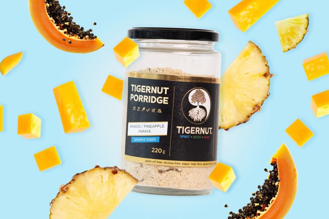 Kaše z tygřích ořechů s lyofilizovaným mangem, ananasem a sušenou papájou. Rychlá, chutná a výživná snídaně, která podporuje trávení, vyživuje střevní mikrobiom a je vhodná pro celou rodinu.