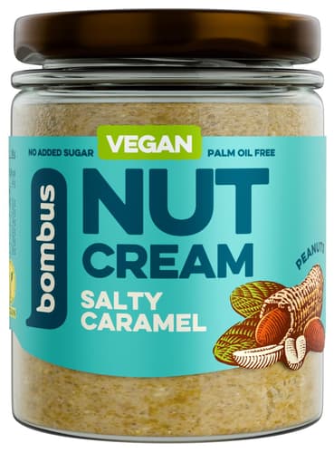 Ochucený arašídový krém Bombus je kombinace pečlivě vybraných arašídů, datlí a slaného karamelu. Neobsahuje žádný přidaný cukr, mléko ani palmový tuk.