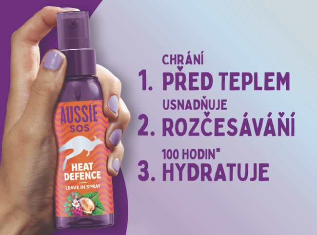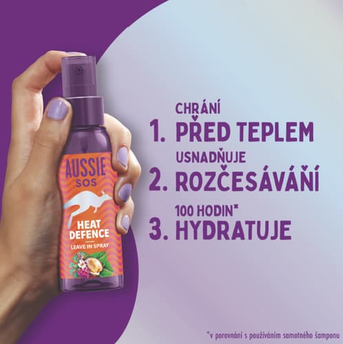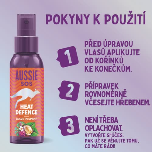 Aussie SOS Heat Defence je bezoplachový sprej, který se postará o to, aby vaše vlasy zvládly fén, žehličku i kulmu bez újmy. Díky australským superpotravinám chrání vlasy před teplem, usnadňuje rozčesávání a poskytuje až 100 hodin hydratace. Aplikujte na vlhké vlasy, neoplachujte a bez obav tvořte účesy podle nálady.