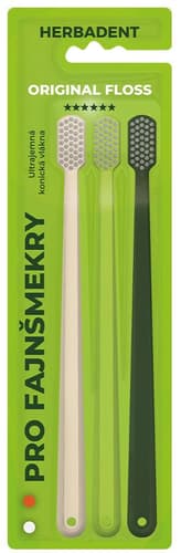 Herbadent Original Floss je speciálně navržený zubní kartáček s ultra jemnými kónickými vlákny, která se zužují ke špičce a dokonale pronikají i do těžko dostupných mezizubních prostor. Díky tomu zajišťuje precizní odstranění plaku a nečistot podél linie dásní – šetrně, ale účinně. Kartáček je vhodný i pro velmi citlivé zuby a dásně, a ocení ho i osoby s ortodontickými aparáty či začínající parodontózou. Ergonomická rukojeť zajišťuje pohodlný úchop a správné vedení kartáčku. Moderní technologie vláken typu "floss" v sobě spojuje výhody jemnosti klasického kartáčku a účinnost mezizubního čištění.