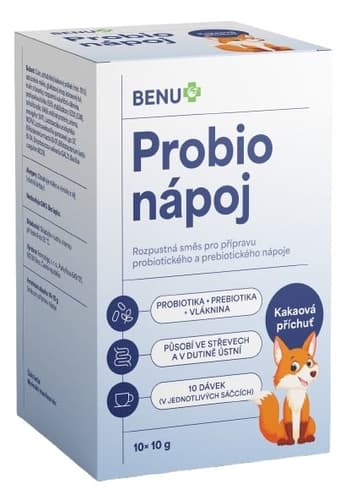 BENU Probio nápoj s lahodnou kakaovou příchutí je speciální směs probiotik a prebiotik se symbiotickým efektem, podpořeným rozpustnou vlákninou. Je vhodný pro dospělé i děti od 3 let, včetně období antibiotické léčby, a je zcela bez lepku. Praktické jednotlivé sáčky jsou ideální na cesty. Balení obsahuje 10x10g.