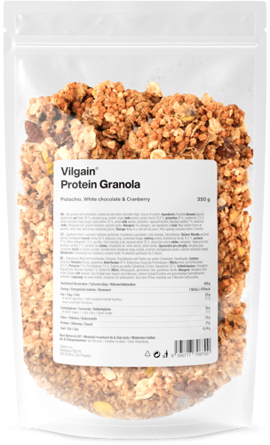 Křupavá granola s vysokým obsahem proteinu značky Vilgain. Směs pečených kusů bezlepkových ovesných vloček, pistácií a brusinek obohacená o proteinové křupinky z bílé čokolády.