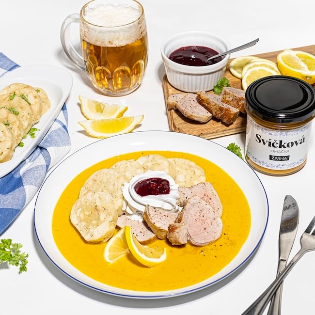 Rostlinná omáčka inspirovaná klasickým českým pokrmem svíčkové omáčky. Obsahuje pečenou zeleninu jako mrkev, cibuli, petržel a celer, směs koření a lahůdkové droždí, které ji dodává umami chuť. Je vhodná pro vegany a vegetariány, kteří si chtějí vychutnat českou klasiku bez živočišných produktů.