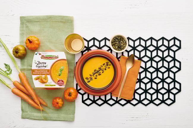 Krémová polévka s dýní a mrkví značky DimmidiSì. Polévka je vyrobená z kvalitní dýně a sladké mrkve a neobsahuje přidané konzervanty. Má jemnou nasládlou chuť. Polévka je připravena k okamžitému servírování – stačí ji ohřát. Vhodná i pro vegetariány.