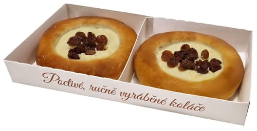 Ručně vyráběné tlačené koláče z kynutého těsta s tvarohovou náplní a rozinkami na povrchu. Zabalením si koláče udrží vláčnost po celou dobu trvanlivosti.