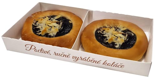 Ručně vyráběné tlačené koláče z kynutého těsta s povidlovou náplní a mandlemi na povrchu. Zabalením si koláče udrží vláčnost po celou dobu trvanlivosti.