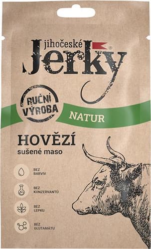 Sušené zauzené pásky čisté svaloviny hovězího masa, dochucené mořskou solí. Vyrobeno ze 100% čisté hovězí svaloviny. Jerky vynikají vysokým obsahem bílkovin a zároveň nízkým obsahem tuků, vznikají z libového masa, které je ochucené pouze přírodními složkami, jsou proto bez lepku, umělých dochucovadel, barviv či konzervantů.