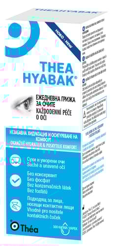 Zdravotnický prostředek. TheaHyabak jsou zvlhčující oční kapky bez konzervačních látek, které přináší okamžitou a dlouhodobou úlevu od suchých a unavených očí (pálení, řezání, pocit písku v očích nebo zarudnutí očí). Dále také k lubrikaci kontaktních čoček při pocitu diskomfortu oka i při nasazených kontaktních čočkách. TheaHyabak je doporučován ke zvlhčení a lubrikaci očí v případě suchosti či únavy v důsledku vnějších faktorů, jako je vítr, kouř, znečištění, prach, suché teplo, klimatizace, letecká doprava, dlouhodobá práce s počítačem nebo dlouhé řízení auta. Hlavní výhody: 0,15 % hyaluronát sodný – intenzivní hydratace a zvlhčení povrchu oka. Vhodný pro děti a dospělé včetně těhotných a kojících žen. Bez konzervačních látek, bez fosfátů – vhodné i pro citlivé oči. Snadno stlačitelná ABAK lahvička – hygienická aplikace bez rizika kontaminace. Lze používat až 6 měsíců po otevření. Kompatibilní se všemi typy kontaktních čoček. Balení obsahuje 10 ml.