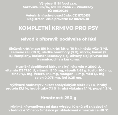 BiBi Food Krůtí hudry – čerstvě vařená porce z krůtího masa, zeleniny a bylinek. Poctivě sestavené a v páře připravené kompletní jídlo pro psy, které vzniká z čerstvých surovin od českých dodavatelů. Základem je 50 % krůtího masa z Farmy Česká Krůta a 10 % krůtích jater. Doplněno je zeleninou, ovocem a bylinkami včetně červeného zelí, sladkých brambor, mrkve, banánu, žampionů, chia semínek nebo koriandru.