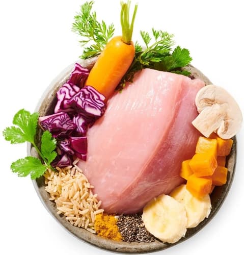 Krůtí maso (50%), krůtí játra (10%), hnědá rýže (5%), červené zelí (10%), sladké brambory (9%), mrkev, banán (5%), žampiony, koriandr, lososový olej, olivový olej, pivovarské kvasnice, chia a kurkuma.