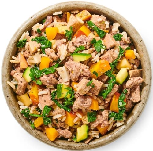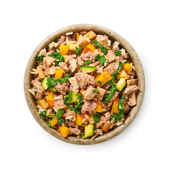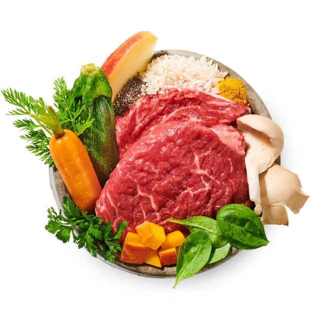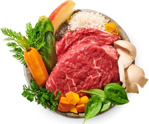 hovězí maso (40%), hovězí srdce (15%), hovězí játra (5%), bílá rýže (5%), špenát (10%), dýně, mrkev, cuketa, jablko (5%), houby, petržel, lososový olej, olivový olej, pivovarské kvasnice, chia a kurkuma