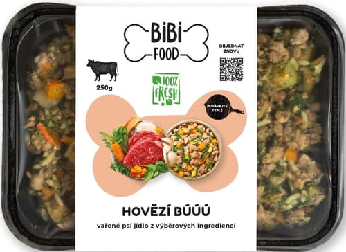 BiBi Food Hovězí búúú – opravdové psí jídlo v páře. Poctivě sestavené a v páře připravené kompletní jídlo pro psy, které vzniká z čerstvých surovin od českých dodavatelů. V hlavní roli šetrně dušené hovězí maso (40%), hovězí srdce (15%) a hovězí játra (5%), špenát, jablka a další voňavé suroviny od lokálních farmářů, které dohromady tvoří skvělou porci domácího vařeného jídla.