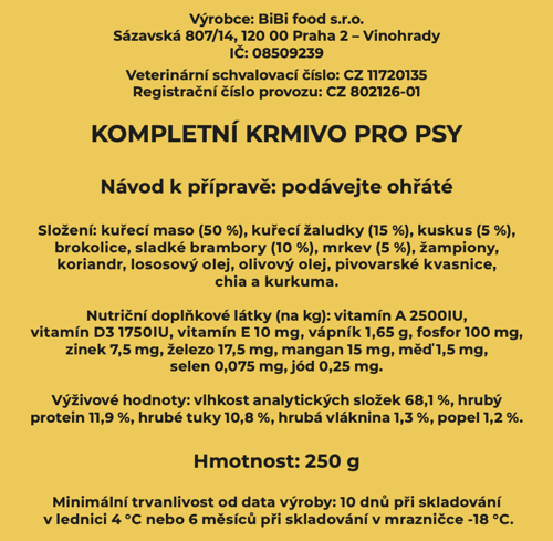BiBi Food Kuře z kuřete – čerstvě vařená porce z kuřecího masa, zeleniny a bylinek. Poctivě sestavené a v páře připravené kompletní jídlo pro psy, které vzniká z čerstvých surovin od českých dodavatelů. Základem je 50 % kuřecího masa a 15 % kuřecích jater. Doplněno je zeleninou, ovocem a bylinkami včetně sladké brambory, brokolice a kuskusu.